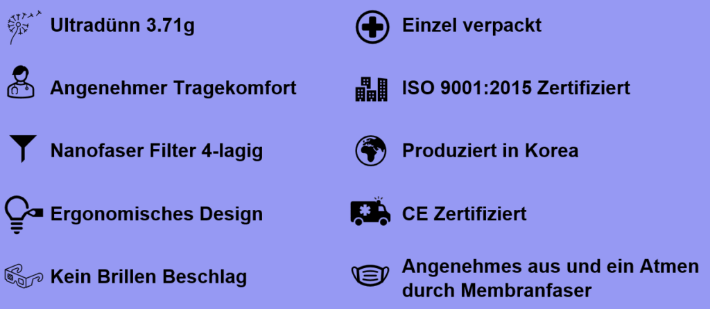 Da Luftpartikel eine Größe von 0,004µm haben, können diese problemlos durch die Membran gelangen, wodurch die Atemfähigkeit beim Tragen der Maske nicht beeinträchtigt wird – sprich man atmet nahezu frei beim Tragen der Maske.