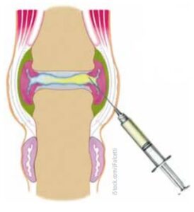 Einspritzen der Hyaluronsäure in das schmerzende Gelenk